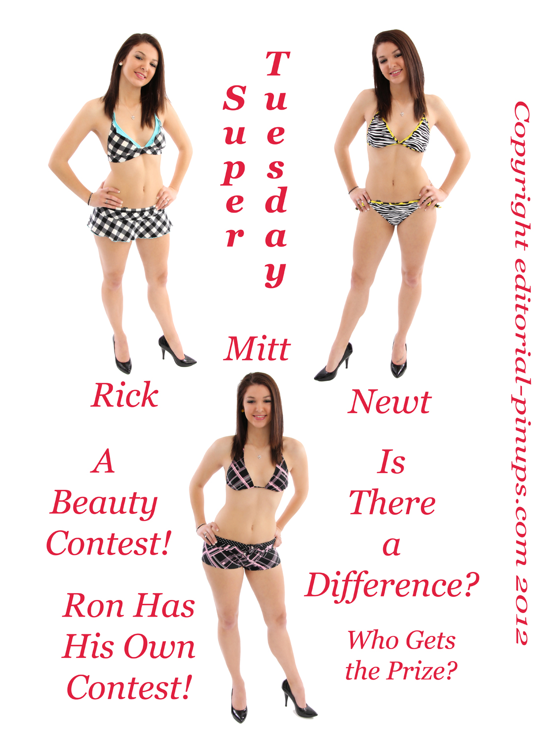While Ron Paul is definitely of a different idea set, when you get down to it Newt, Mitt, and Rick are fairly similar. Ask a question and even though they think the are answering with different answers, listen carefully, it all sounds pretty much the same, with just a little different dressing.. Therefore, it is a beauty contest. Let's see who walks away the winner!!!
