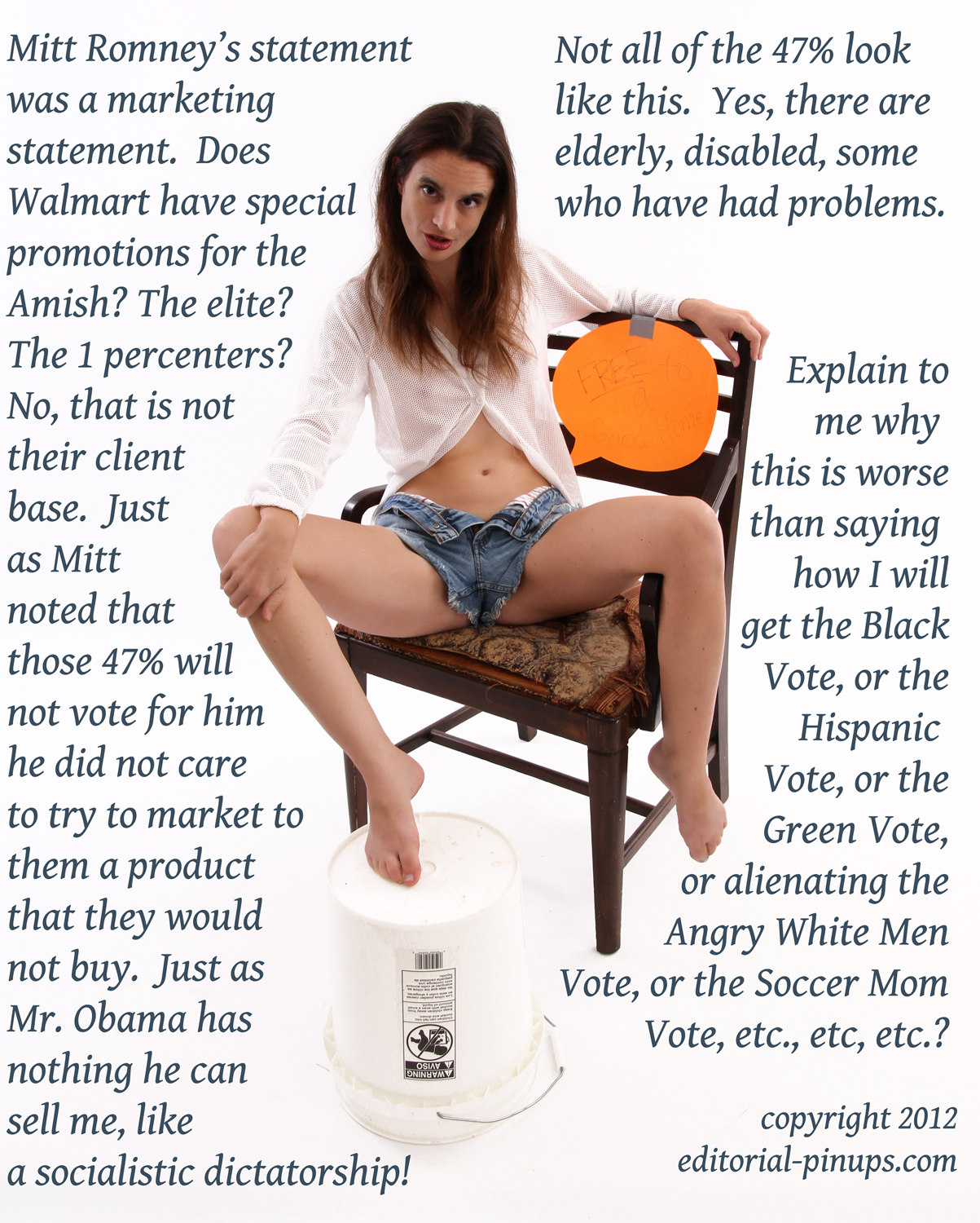 So it is OK to to say let's get the Black Vote, the Hispanic vote, the Asian vote, but it is incorrect to say that you will not get the voters that would risk cutting themselves off by someone who is promising serious review of how they make their income. Mitt Romney, does he not care about them? Only from a marketing standpoint. Mr Obama looks to create dependency. By creating more dependencies Mr. Obama looks to create a group that will vote no other way than to continue that dependency. Stores knowingly admit their markets. Why can't politicians?