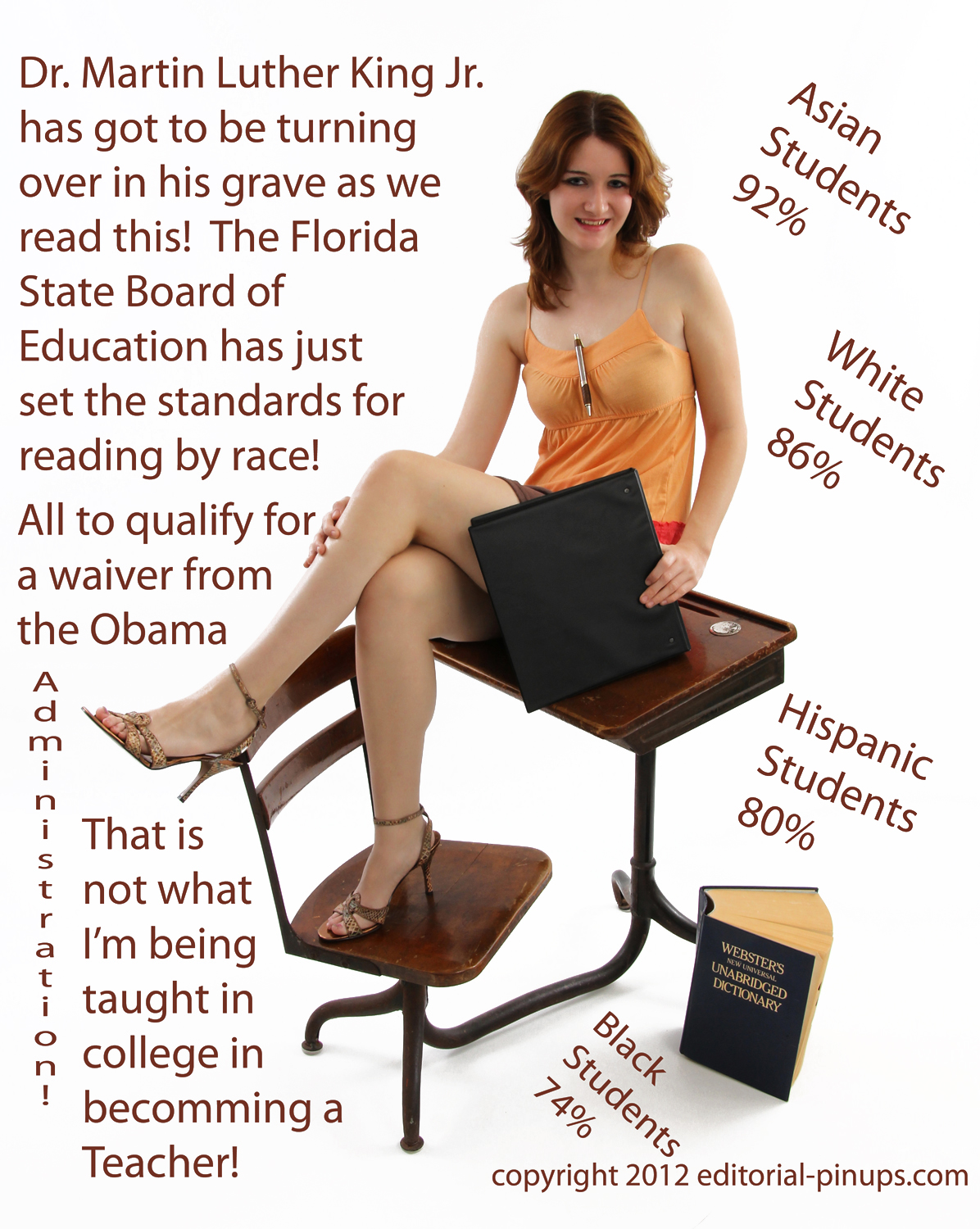 You must congratulate the Obama administration for another addition to the institute of racism. The Florida State Board of Education must have missed the mark on reading scores. Therefore it is requesting a waiver from the Obama administration. A funny thing happened on the way to the waiver application room. The board says they were told to create discriminatory and racial standard adjustments. Not what we have been told since the 1960's when Dr. Martin Luther King Jr. marched for equality. Hey Jesse Jackson and Al Sharpton, why so silent!